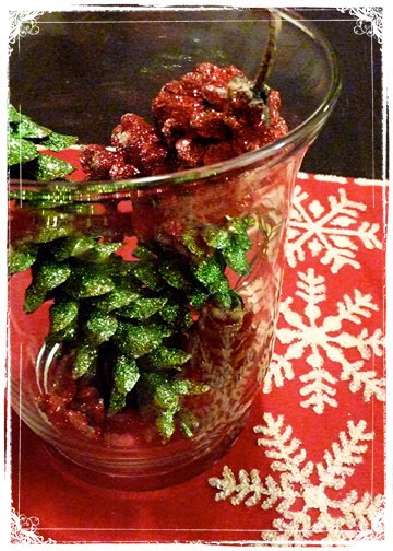 We have been glitter crazy this year. We covered the clam shells that we had and then I went outside to pick up some pine cones. Guess what got the royal glitter treatment?